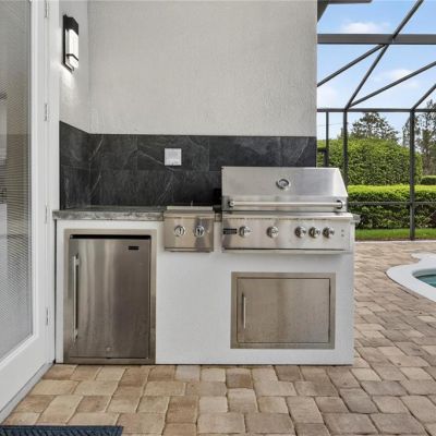 Balcony, French Doors, Irrigation System, Lighting, Outdoor Grill, Outdoor Kitchen, Rain Gutters, Sidewalk, Sprinkler Metered