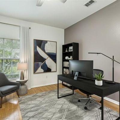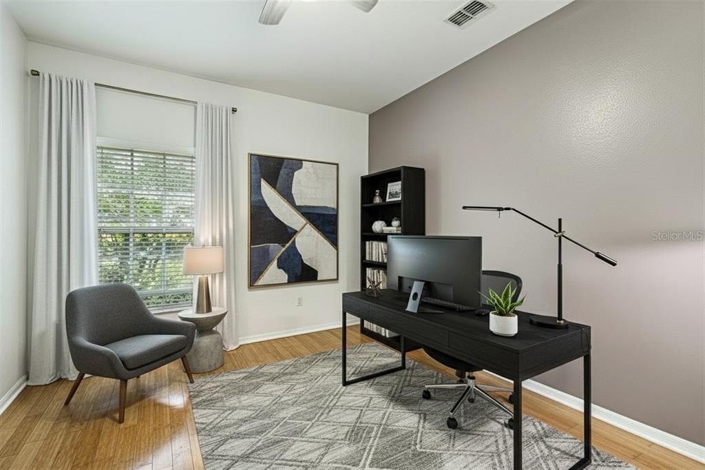 Ceiling Fan(s), Eating Space In Kitchen, Primary Bedroom Main Floor, Solid Wood Cabinets, Split Bedroom, Stone Counters, Thermostat, Window Treatments
