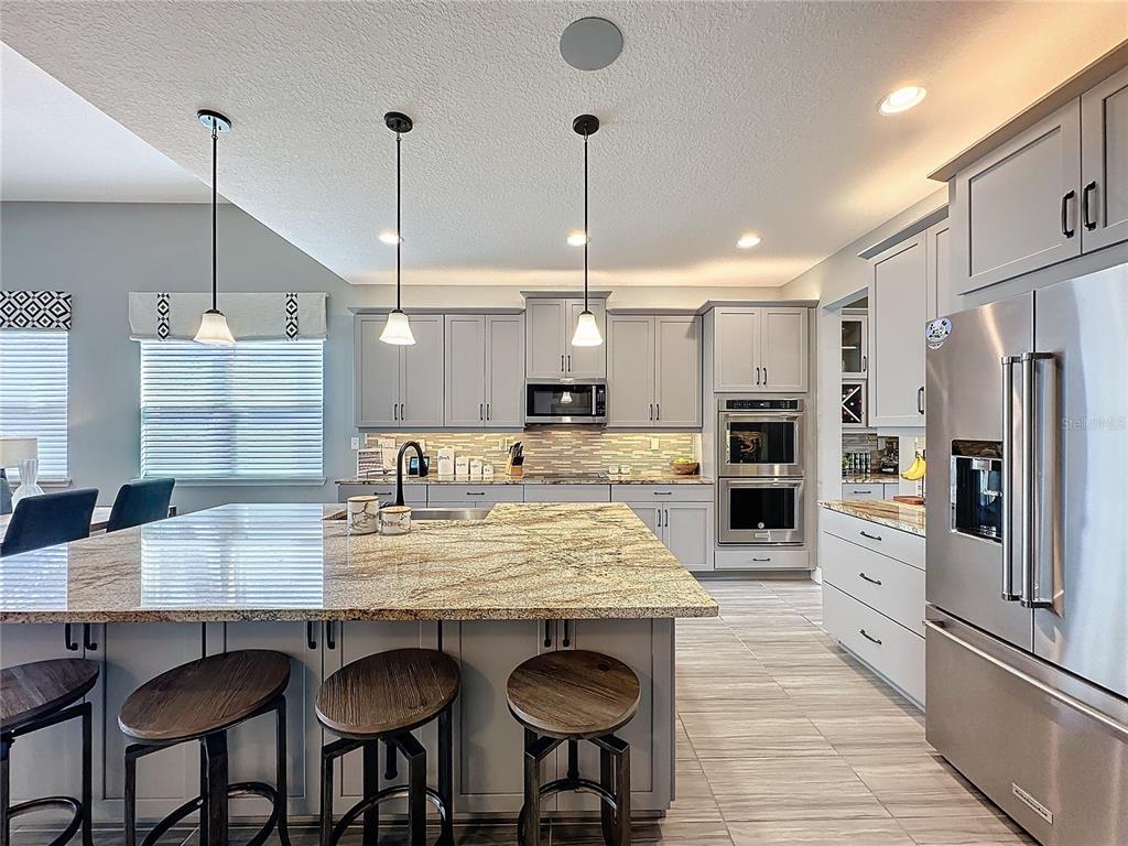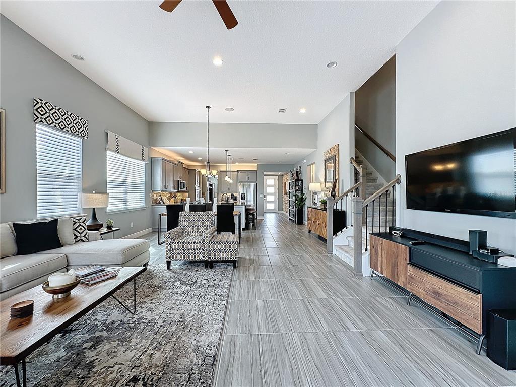 Built-in Features, Ceiling Fan(s), Dry Bar, Eating Space In Kitchen, High Ceilings, Kitchen/Family Room Combo, Open Floorplan, Primary Bedroom Main Floor, Solid Surface Counters, Solid Wood Cabinets, Stone Counters, Thermostat, Walk-In Closet(s), Window Treatments