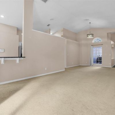 Ceiling Fan(s), High Ceilings, Kitchen/Family Room Combo, Living Room/Dining Room Combo, Open Floorplan, Solid Surface Counters, Solid Wood Cabinets, Split Bedroom, Thermostat, Vaulted Ceiling(s), Walk-In Closet(s), Window Treatments