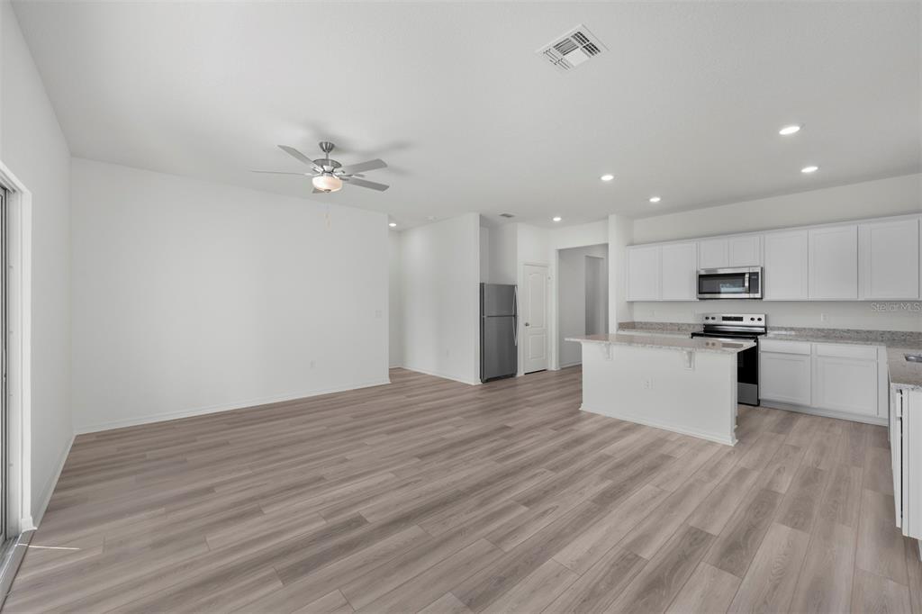 Ceiling Fan(s), High Ceilings, Kitchen/Family Room Combo, Living Room/Dining Room Combo, Open Floorplan, Pest Guard System, Primary Bedroom Main Floor, Solid Wood Cabinets, Stone Counters, Thermostat, Walk-In Closet(s), Window Treatments