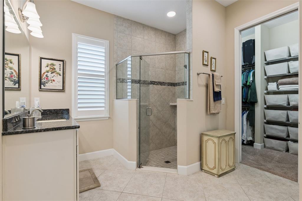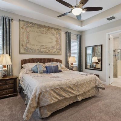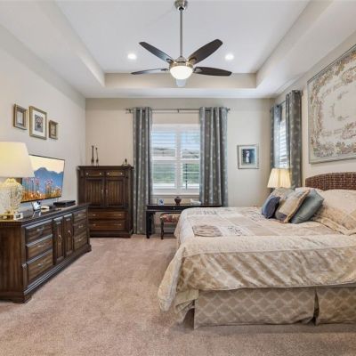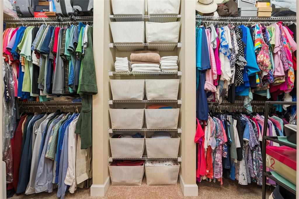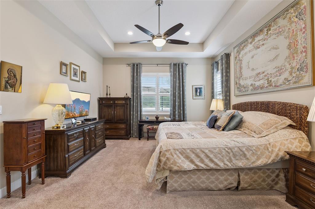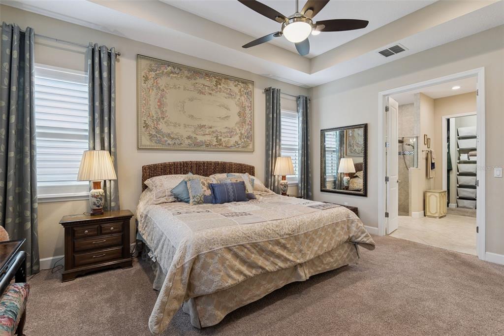 Built-in Features, Ceiling Fan(s), Crown Molding, Open Floorplan, Primary Bedroom Main Floor, Solid Wood Cabinets, Split Bedroom, Stone Counters, Thermostat, Tray Ceiling(s), Walk-In Closet(s), Window Treatments