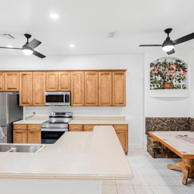Ceiling Fan(s), Crown Molding, Eating Space In Kitchen, High Ceilings, Kitchen/Family Room Combo, Solid Surface Counters, Solid Wood Cabinets, Split Bedroom, Tray Ceiling(s), Walk-In Closet(s)