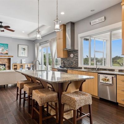 Built-in Features, Ceiling Fan(s), Central Vacuum, Dry Bar, Eating Space In Kitchen, High Ceilings, Open Floorplan, Solid Surface Counters, Solid Wood Cabinets, Split Bedroom, Stone Counters, Thermostat, Tray Ceiling(s), Vaulted Ceiling(s), Walk-In Closet(s), Wet Bar