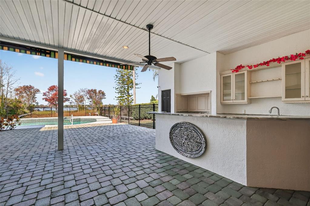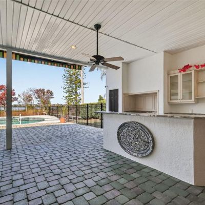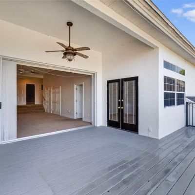 Balcony, French Doors, Lighting, Outdoor Kitchen, Rain Gutters, Sidewalk, Sliding Doors