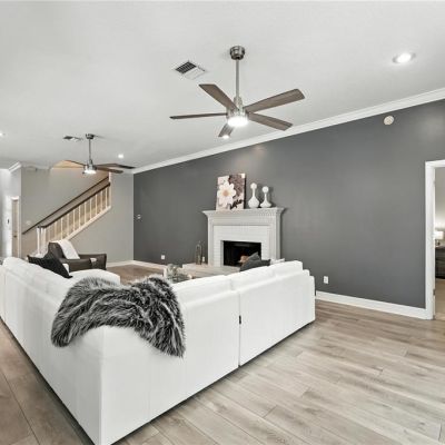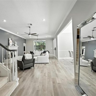 Ceiling Fan(s), Chair Rail, Crown Molding, High Ceilings, Kitchen/Family Room Combo, Living Room/Dining Room Combo, Open Floorplan, Primary Bedroom Main Floor, Solid Surface Counters, Solid Wood Cabinets, Split Bedroom, Thermostat, Walk-In Closet(s), Window Treatments