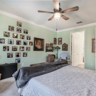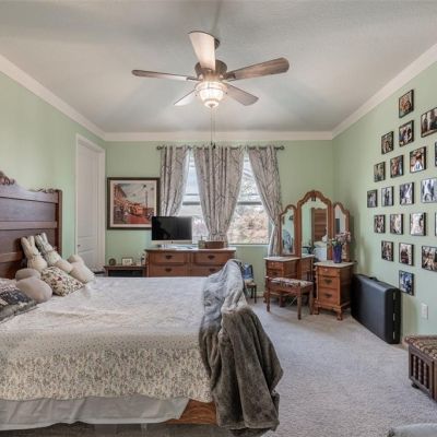 Attic Fan, Built-in Features, Ceiling Fan(s), Crown Molding, Open Floorplan, Primary Bedroom Main Floor, Solid Surface Counters, Thermostat, Thermostat Attic Fan, Window Treatments