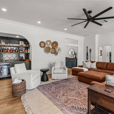 Ceiling Fan(s), Crown Molding, Eating Space In Kitchen, High Ceilings, L Dining, Living Room/Dining Room Combo, Primary Bedroom Main Floor, Skylight(s), Solid Surface Counters, Solid Wood Cabinets, Thermostat, Thermostat Attic Fan, Walk-In Closet(s), Wet Bar, Window Treatments