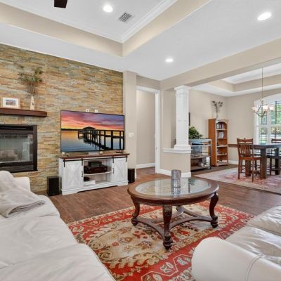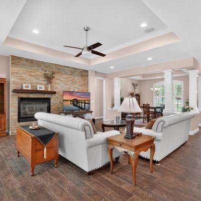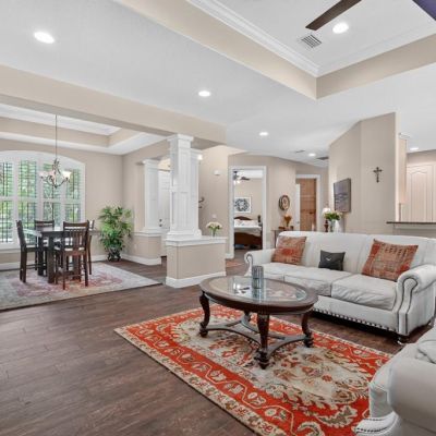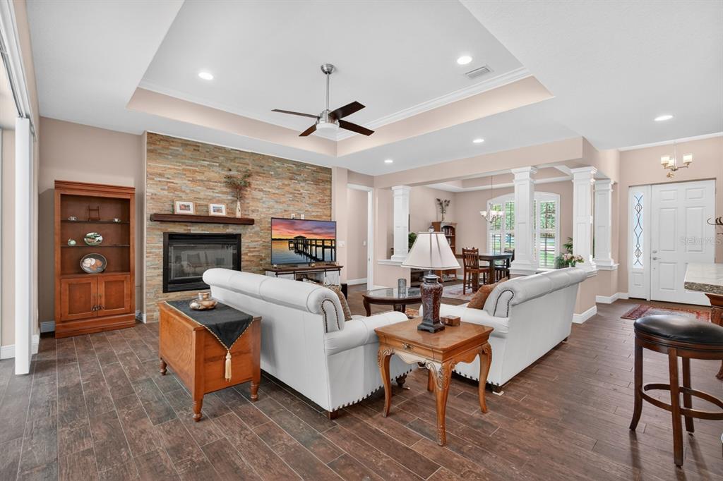Built-in Features, Ceiling Fan(s), Coffered Ceiling(s), Crown Molding, Eating Space In Kitchen, Kitchen/Family Room Combo, Open Floorplan, Primary Bedroom Main Floor, Split Bedroom, Stone Counters, Thermostat, Walk-In Closet(s), Window Treatments