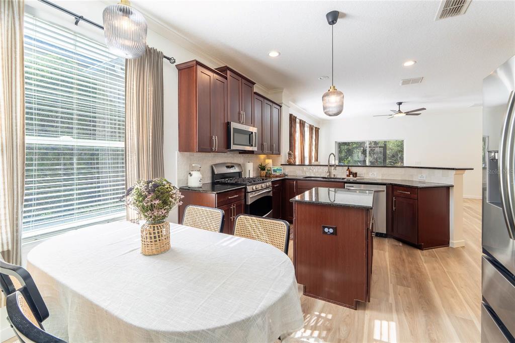 Built-in Features, Ceiling Fan(s), Eating Space In Kitchen, Kitchen/Family Room Combo, Open Floorplan, Solid Surface Counters, Solid Wood Cabinets, Split Bedroom, Stone Counters, Thermostat, Walk-In Closet(s), Window Treatments
