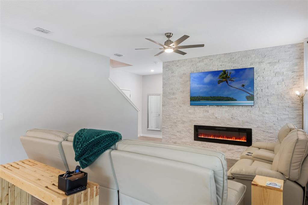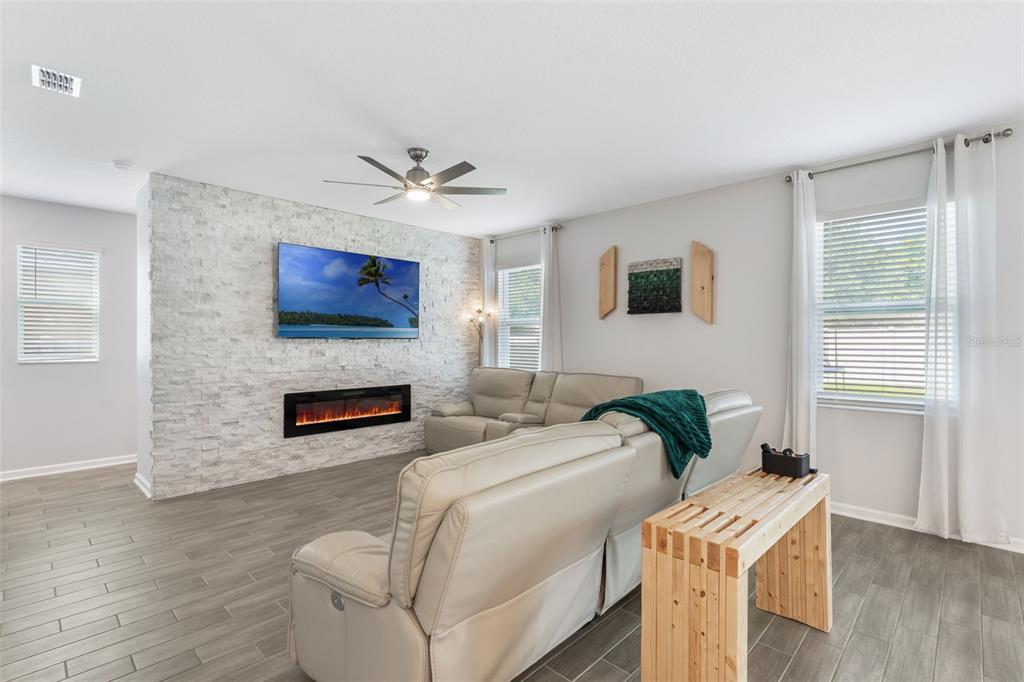 Ceiling Fan(s), Eating Space In Kitchen, High Ceilings, Kitchen/Family Room Combo, Open Floorplan, PrimaryBedroom Upstairs, Solid Surface Counters, Solid Wood Cabinets, Split Bedroom, Stone Counters, Thermostat, Walk-In Closet(s), Window Treatments