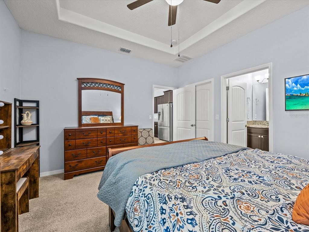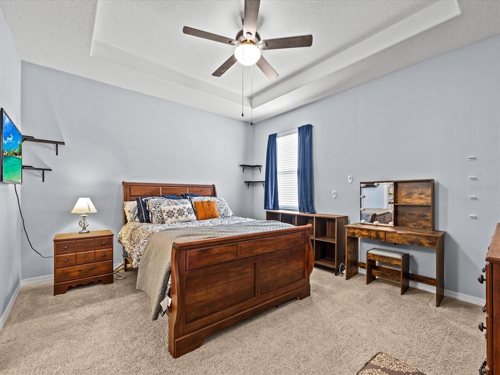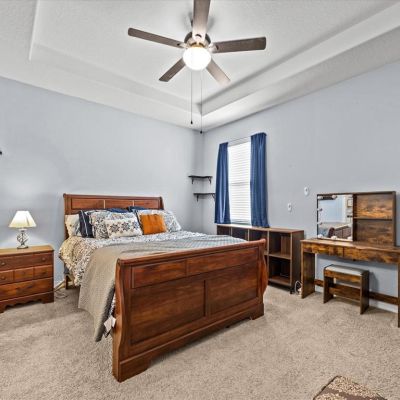 Ceiling Fan(s), Eating Space In Kitchen, Kitchen/Family Room Combo, Primary Bedroom Main Floor, Solid Wood Cabinets, Split Bedroom, Stone Counters, Thermostat, Walk-In Closet(s), Window Treatments