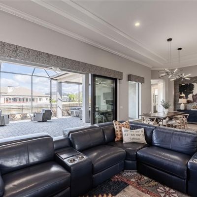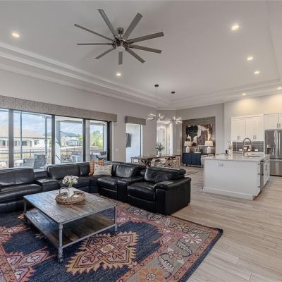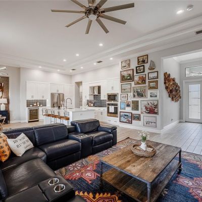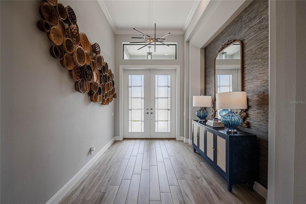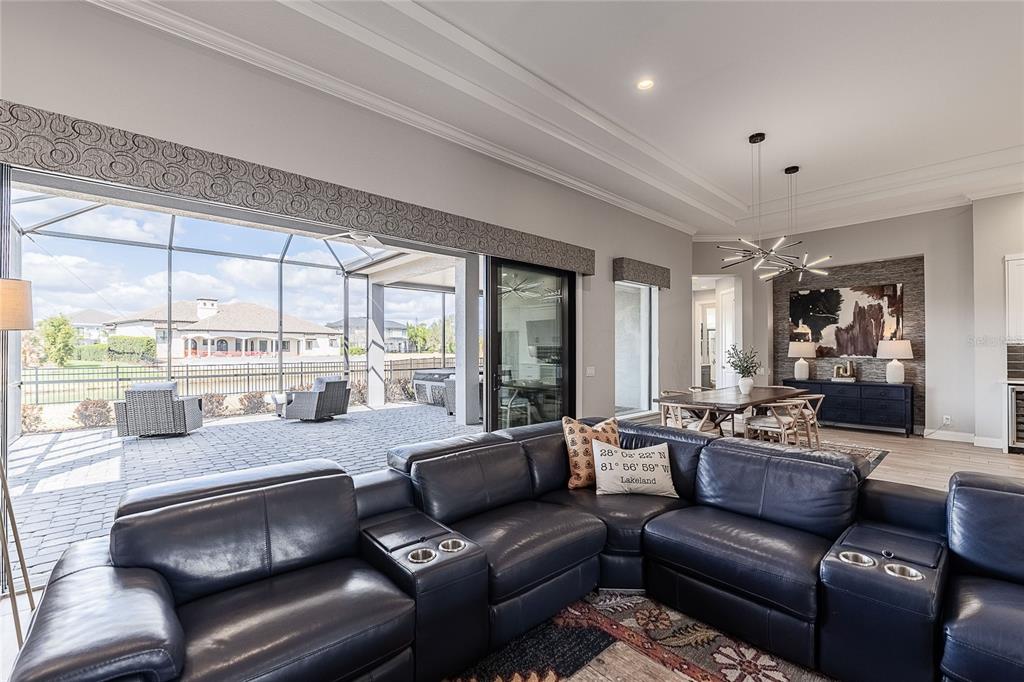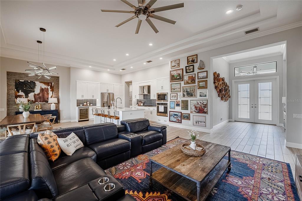 Ceiling Fan(s), Coffered Ceiling(s), Crown Molding, Dry Bar, High Ceilings, Kitchen/Family Room Combo, Living Room/Dining Room Combo, Open Floorplan, Pest Guard System, Primary Bedroom Main Floor, Solid Surface Counters, Solid Wood Cabinets, Split Bedroom, Walk-In Closet(s), Window Treatments
