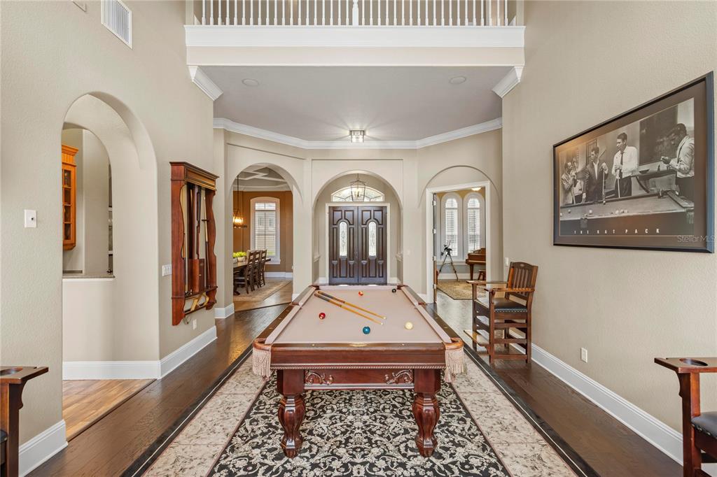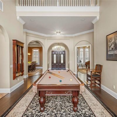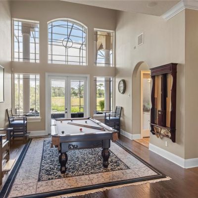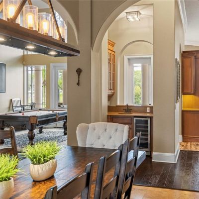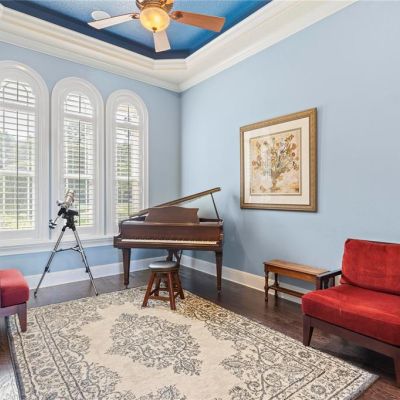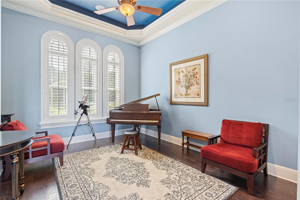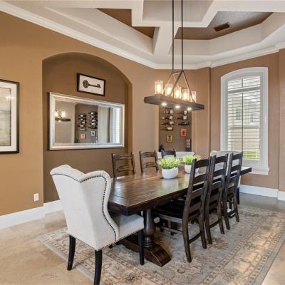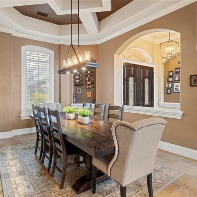 Built-in Features, Ceiling Fan(s), Crown Molding, Eating Space In Kitchen, High Ceilings, Kitchen/Family Room Combo, Primary Bedroom Main Floor, Solid Wood Cabinets, Split Bedroom, Stone Counters, Thermostat, Tray Ceiling(s), Walk-In Closet(s), Wet Bar, Window Treatments