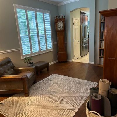 Ceiling Fan(s), Crown Molding, Eating Space In Kitchen, High Ceilings, Kitchen/Family Room Combo, Living Room/Dining Room Combo, Open Floorplan, Primary Bedroom Main Floor, Solid Wood Cabinets, Thermostat, Tray Ceiling(s), Walk-In Closet(s), Window Treatments