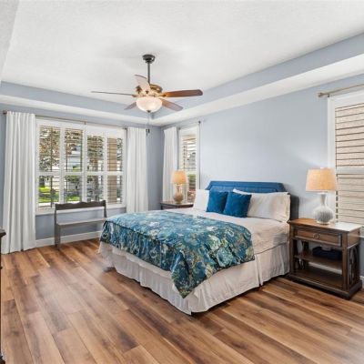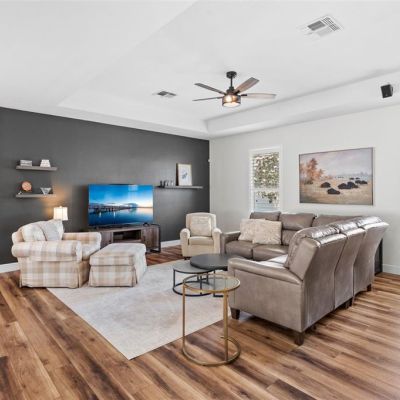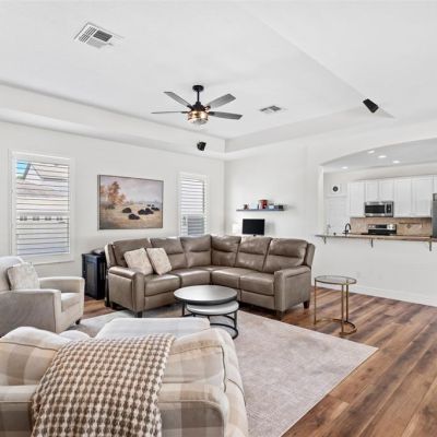 Ceiling Fan(s), Eating Space In Kitchen, Kitchen/Family Room Combo, Living Room/Dining Room Combo, Open Floorplan, Primary Bedroom Main Floor, Solid Surface Counters, Solid Wood Cabinets, Stone Counters, Thermostat, Tray Ceiling(s), Walk-In Closet(s), Window Treatments