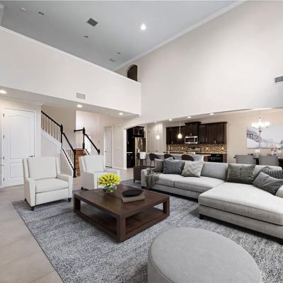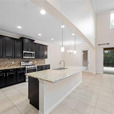 Ceiling Fan(s), Eating Space In Kitchen, High Ceilings, Kitchen/Family Room Combo, Open Floorplan, Primary Bedroom Main Floor, Split Bedroom, Stone Counters, Thermostat, Tray Ceiling(s), Vaulted Ceiling(s), Walk-In Closet(s), Window Treatments