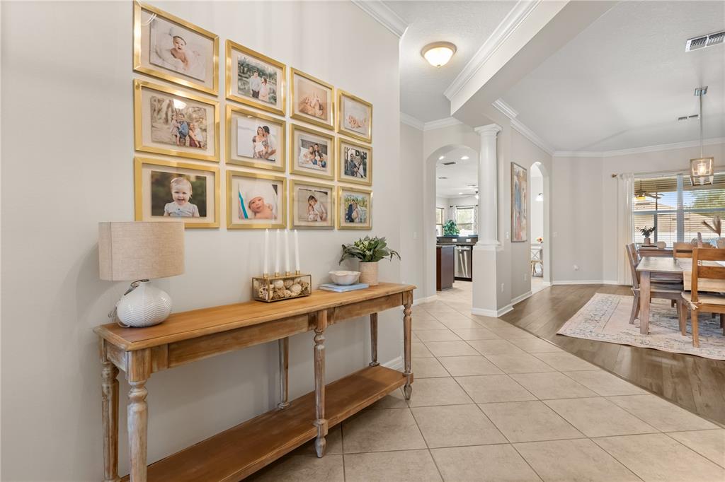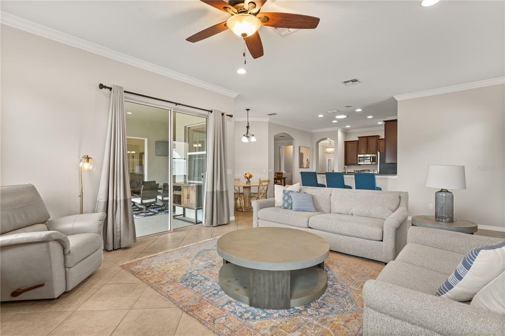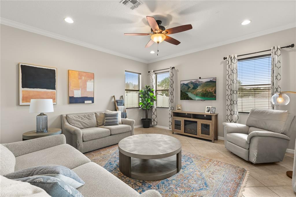 Ceiling Fan(s), Crown Molding, High Ceilings, Kitchen/Family Room Combo, Split Bedroom