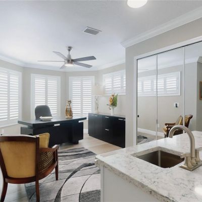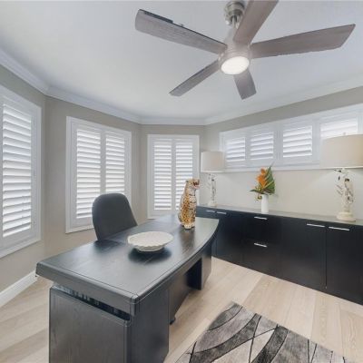 Ceiling Fan(s), Crown Molding, Living Room/Dining Room Combo, Open Floorplan, PrimaryBedroom Upstairs, Solid Surface Counters, Solid Wood Cabinets, Split Bedroom, Walk-In Closet(s), Window Treatments