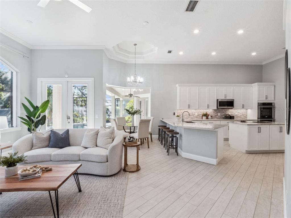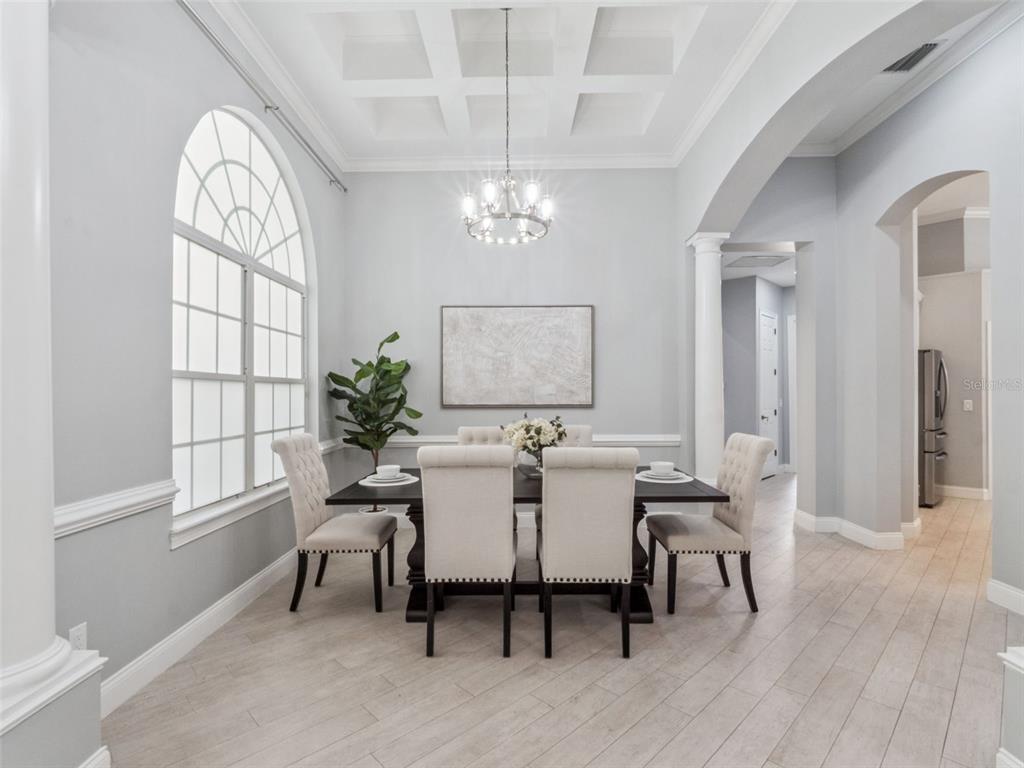 Built-in Features, Ceiling Fan(s), Chair Rail, Coffered Ceiling(s), Crown Molding, Eating Space In Kitchen, High Ceilings, Kitchen/Family Room Combo, Open Floorplan, Primary Bedroom Main Floor, Solid Surface Counters, Solid Wood Cabinets, Split Bedroom, Tray Ceiling(s), Vaulted Ceiling(s), Walk-In Closet(s), Window Treatments