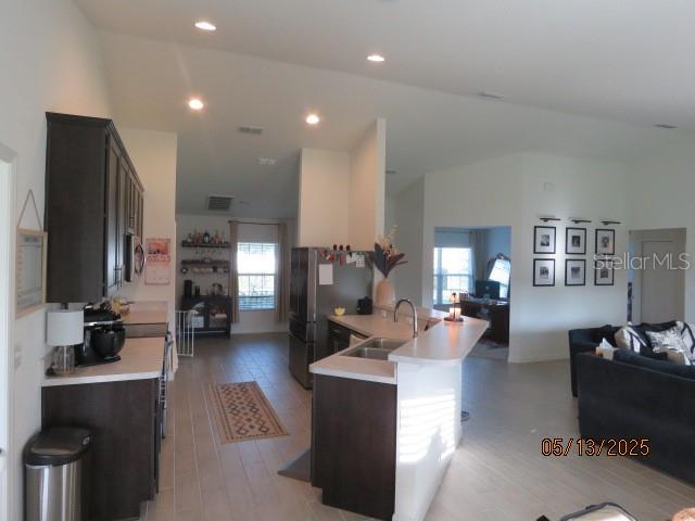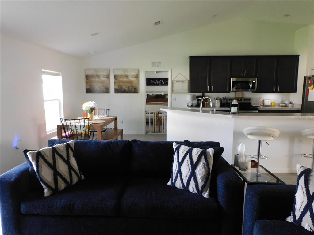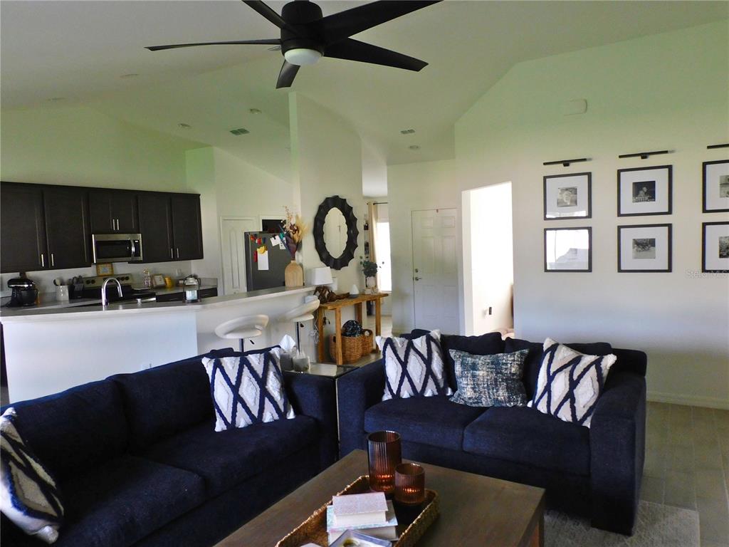 Ceiling Fan(s), Eating Space In Kitchen, High Ceilings, Kitchen/Family Room Combo, Open Floorplan, Primary Bedroom Main Floor, Solid Surface Counters, Vaulted Ceiling(s), Walk-In Closet(s)