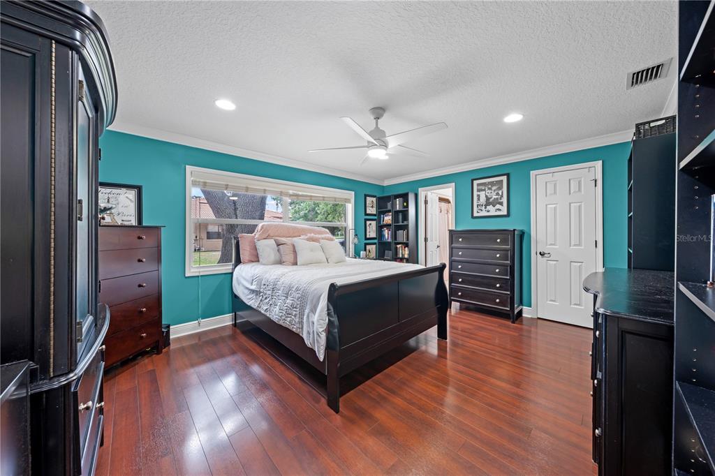 Cathedral Ceiling(s), Ceiling Fan(s), Crown Molding, High Ceilings, Kitchen/Family Room Combo, Primary Bedroom Main Floor, Solid Surface Counters, Solid Wood Cabinets, Split Bedroom, Stone Counters, Walk-In Closet(s)