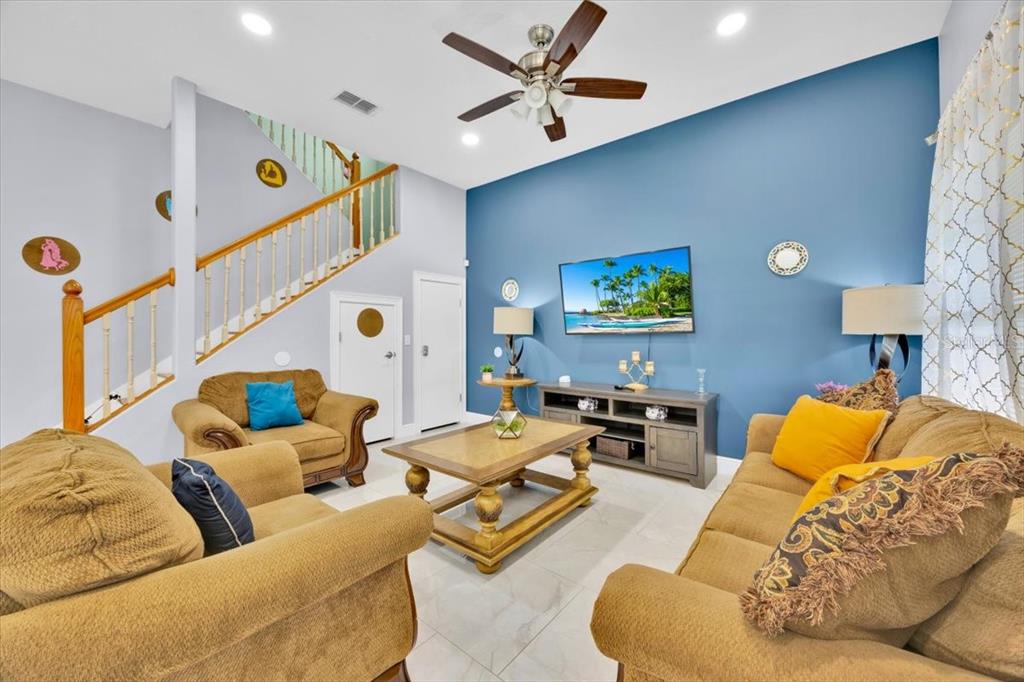 Ceiling Fan(s), High Ceilings, Kitchen/Family Room Combo, Living Room/Dining Room Combo, Open Floorplan, Thermostat, Walk-In Closet(s), Window Treatments