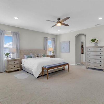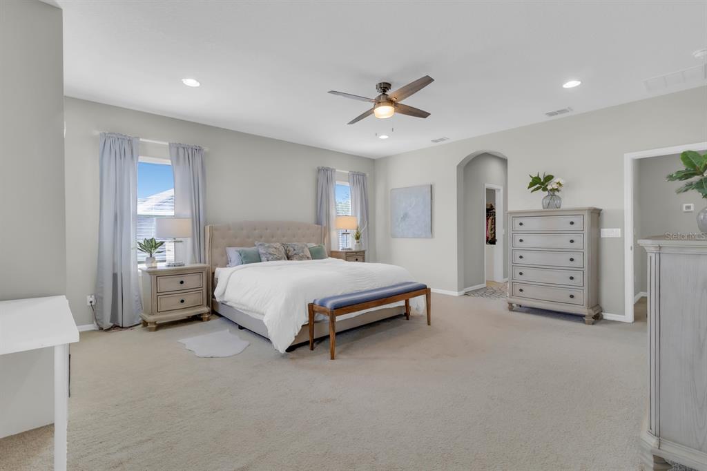 Ceiling Fan(s), Eating Space In Kitchen, High Ceilings, Kitchen/Family Room Combo, Open Floorplan, Primary Bedroom Main Floor, PrimaryBedroom Upstairs, Solid Surface Counters, Split Bedroom, Stone Counters