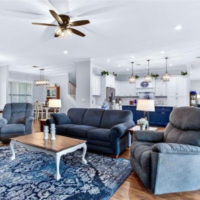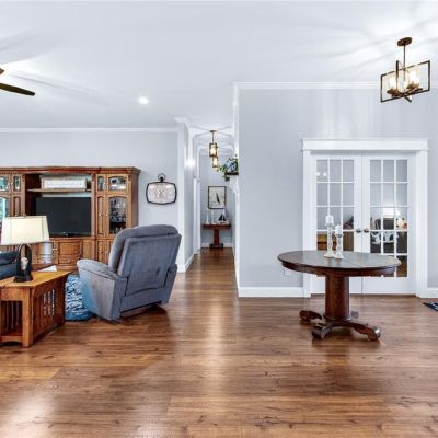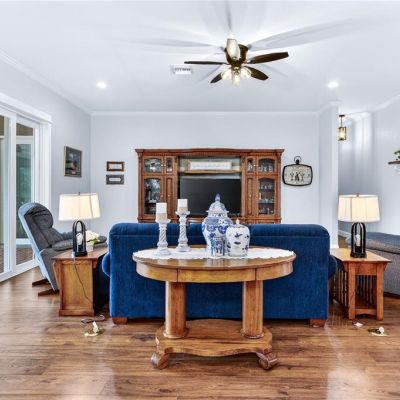Attic Fan, Built-in Features, Ceiling Fan(s), Crown Molding, High Ceilings, Kitchen/Family Room Combo, Open Floorplan, Primary Bedroom Main Floor, Solid Wood Cabinets, Stone Counters, Thermostat, Tray Ceiling(s), Walk-In Closet(s), Window Treatments