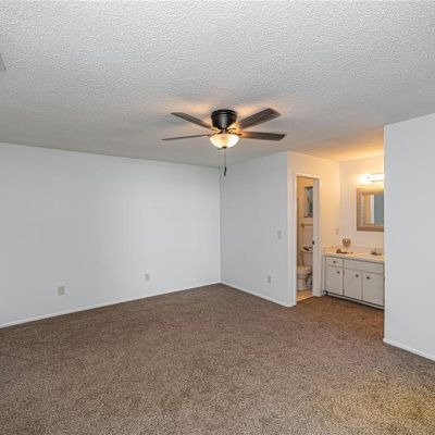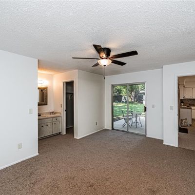 The dining area boasts a pair of sliding glass doors, extending the visual space even further, giving the home a much larger feel to it. Step out back to the open air patio and a backyard perfect for entertaining. The split floor plan separates the master suite from the rest of the house. The master bedroom has fresh new carpet and paint. The well-lit master bath vanity is centered between a walk-in closet with door, and the white, tile-lined, walk-in shower and private toilet room. Another set of sliding glass doors in the master suite adds additional access to the patio and a feeling of bringing the peacefulness of the outdoors into the harmonious yet private interior.