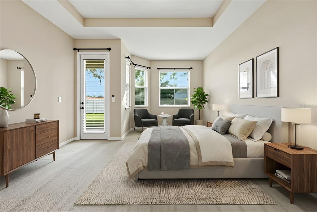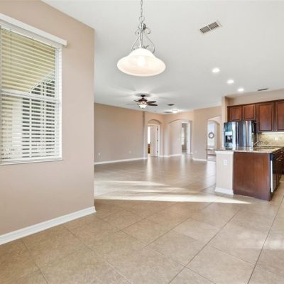 Ceiling Fan(s), Eating Space In Kitchen, High Ceilings, Kitchen/Family Room Combo, Open Floorplan, Primary Bedroom Main Floor, Split Bedroom, Stone Counters, Thermostat, Tray Ceiling(s), Walk-In Closet(s)