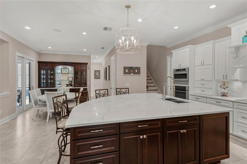 Attic Fan, Built-in Features, Ceiling Fan(s), Crown Molding, Eating Space In Kitchen, High Ceilings, Kitchen/Family Room Combo, Open Floorplan, Primary Bedroom Main Floor, Solid Wood Cabinets, Split Bedroom, Stone Counters, Thermostat, Walk-In Closet(s), Wet Bar, Window Treatments