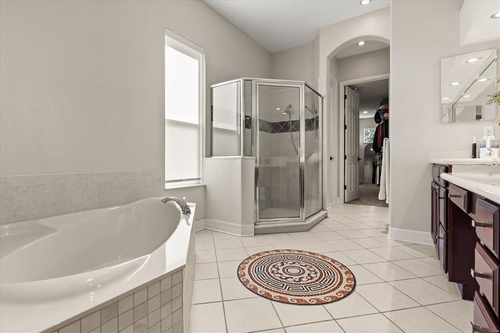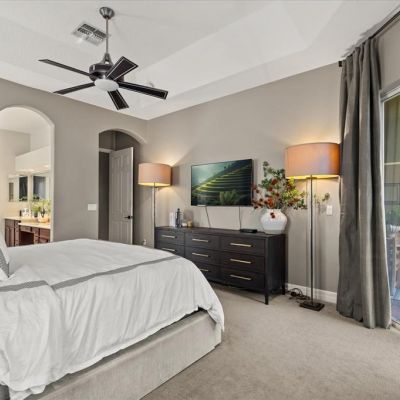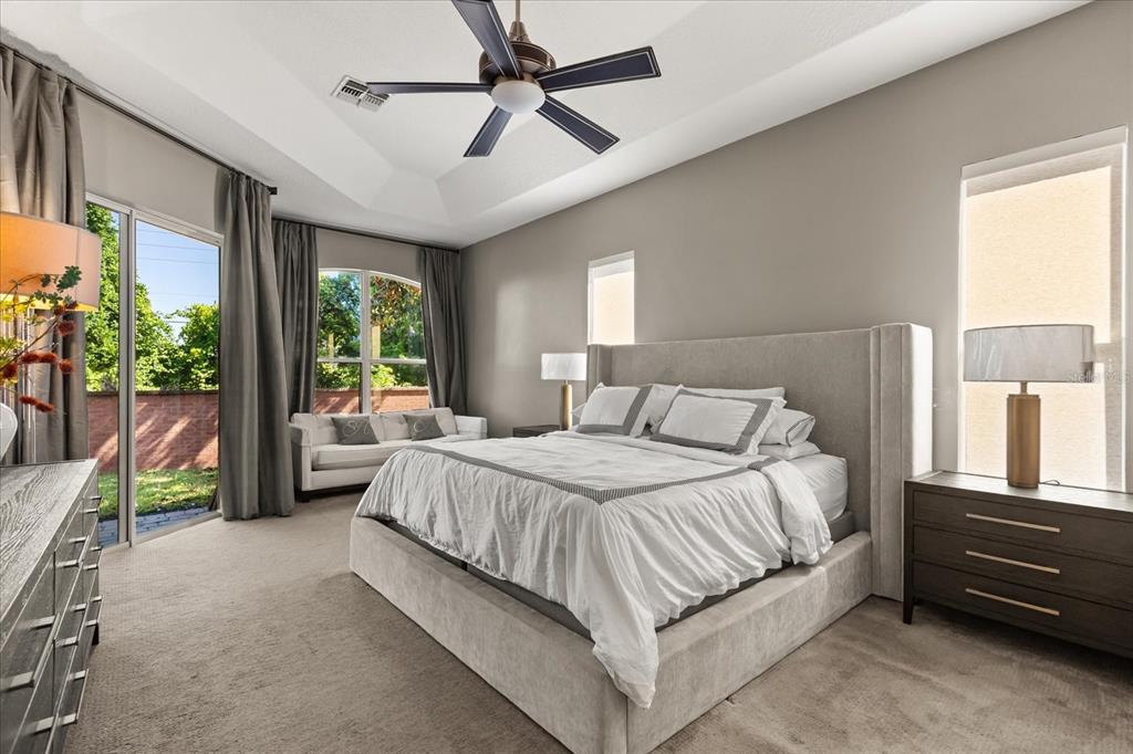 Built-in Features, Ceiling Fan(s), Coffered Ceiling(s), Dry Bar, Eating Space In Kitchen, High Ceilings, Kitchen/Family Room Combo, Living Room/Dining Room Combo, Solid Surface Counters, Solid Wood Cabinets, Split Bedroom, Thermostat, Tray Ceiling(s), Walk-In Closet(s)
