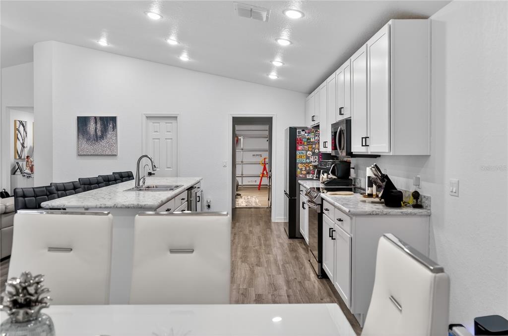 Cathedral Ceiling(s), Eating Space In Kitchen, High Ceilings, Living Room/Dining Room Combo, Open Floorplan, Primary Bedroom Main Floor, Solid Wood Cabinets, Thermostat