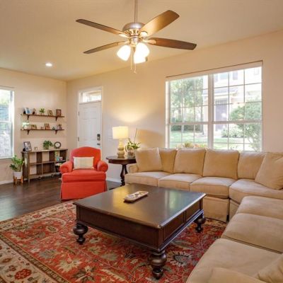 Ceiling Fan(s), Living Room/Dining Room Combo, Open Floorplan, Other, PrimaryBedroom Upstairs, Solid Surface Counters, Solid Wood Cabinets, Split Bedroom, Stone Counters, Thermostat, Walk-In Closet(s), Window Treatments