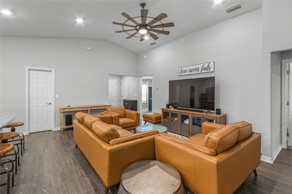 Cathedral Ceiling(s), Ceiling Fan(s), Eating Space In Kitchen, In Wall Pest System, Kitchen/Family Room Combo, Open Floorplan, Primary Bedroom Main Floor, Solid Surface Counters, Solid Wood Cabinets, Split Bedroom, Stone Counters, Thermostat, Tray Ceiling(s), Walk-In Closet(s), Window Treatments