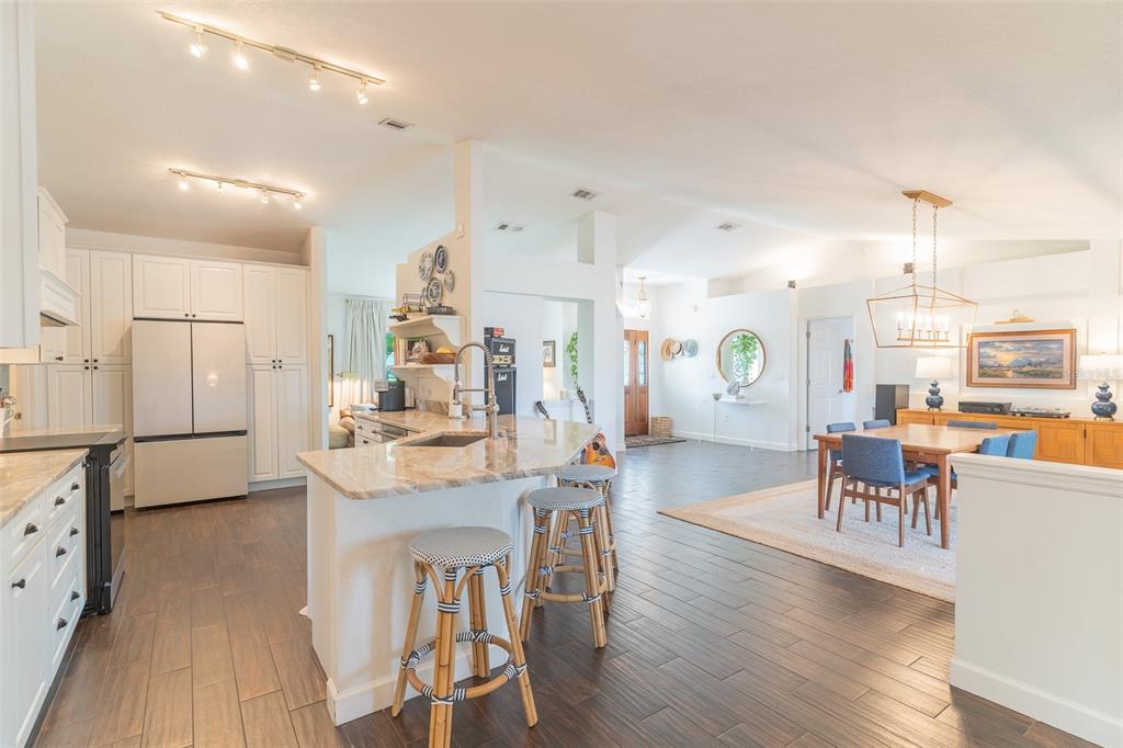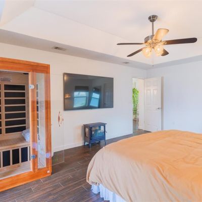Ceiling Fan(s), Eating Space In Kitchen, High Ceilings, Kitchen/Family Room Combo, Open Floorplan, Primary Bedroom Main Floor, Split Bedroom, Stone Counters, Thermostat, Tray Ceiling(s), Walk-In Closet(s)