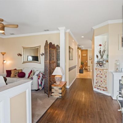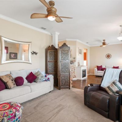 Attic Fan, Ceiling Fan(s), Crown Molding, Open Floorplan, Primary Bedroom Main Floor, Solid Surface Counters, Split Bedroom, Thermostat, Thermostat Attic Fan, Tray Ceiling(s), Vaulted Ceiling(s), Walk-In Closet(s), Window Treatments