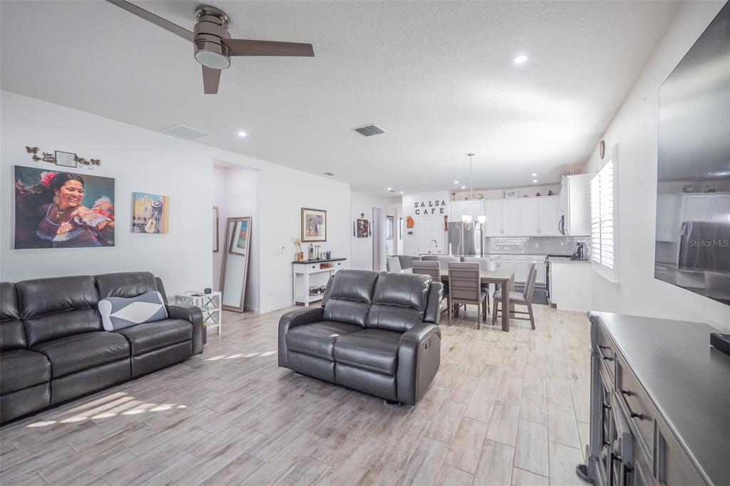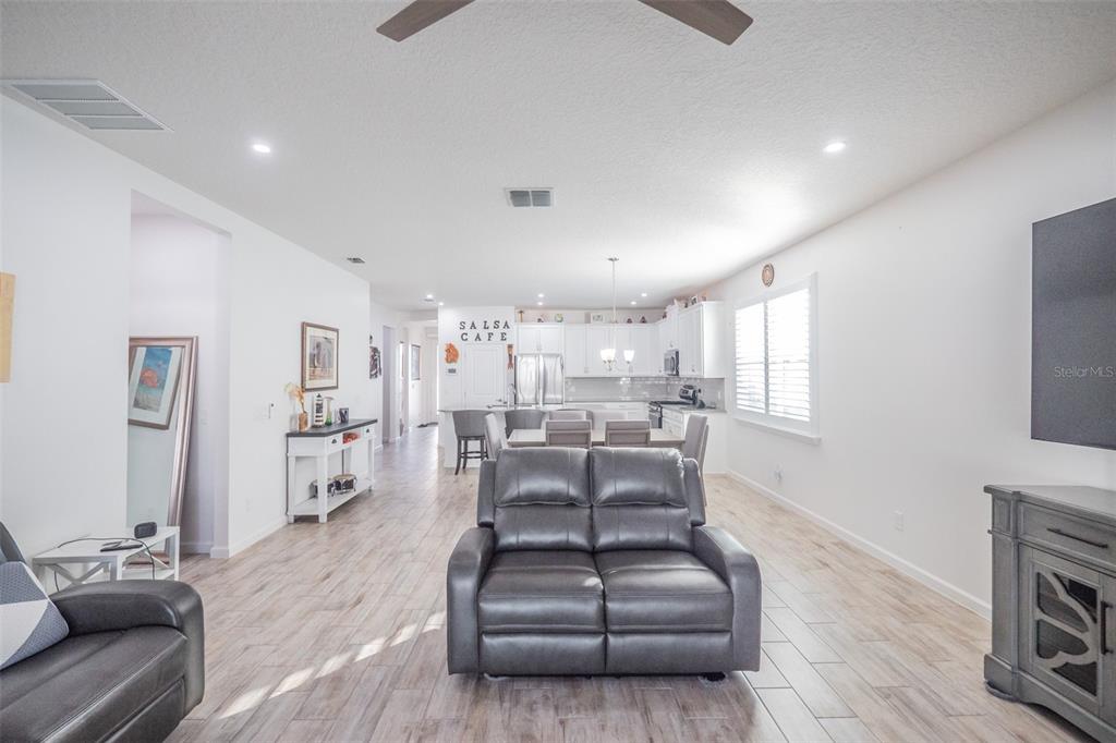 Ceiling Fan(s), High Ceilings, Kitchen/Family Room Combo, Open Floorplan, Primary Bedroom Main Floor, Solid Surface Counters, Solid Wood Cabinets, Split Bedroom, Walk-In Closet(s), Window Treatments