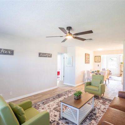 Ceiling Fan(s), L Dining, Living Room/Dining Room Combo, Open Floorplan, Primary Bedroom Main Floor, Solid Wood Cabinets, Stone Counters, Thermostat, Window Treatments