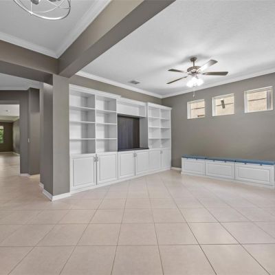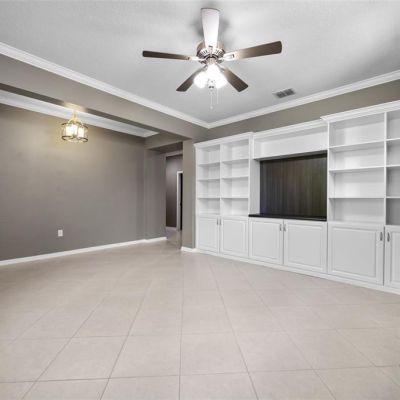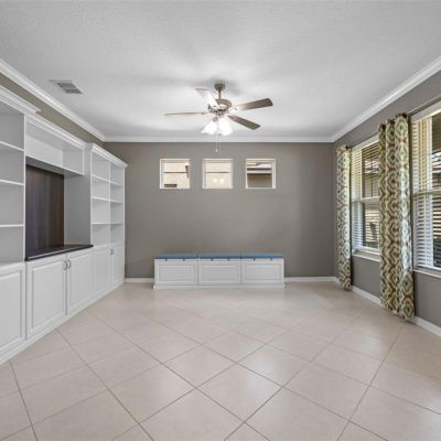 Built-in Features, Ceiling Fan(s), Crown Molding, Eating Space In Kitchen, High Ceilings, Kitchen/Family Room Combo, Open Floorplan, Primary Bedroom Main Floor, Solid Wood Cabinets, Thermostat, Walk-In Closet(s)