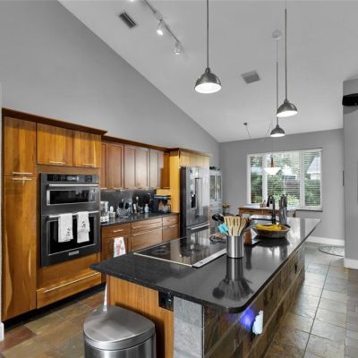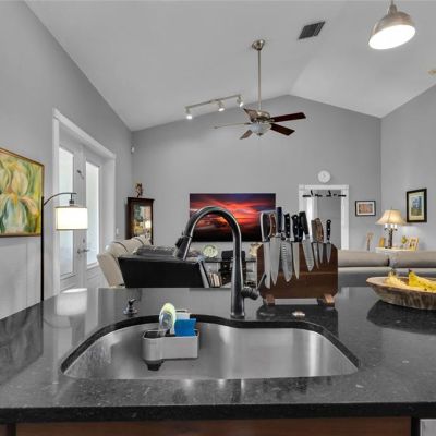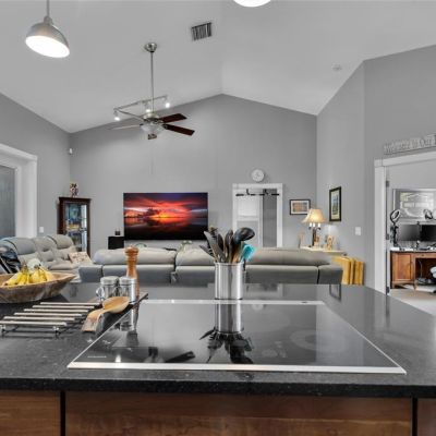 Ceiling Fan(s), High Ceilings, Kitchen/Family Room Combo, Open Floorplan, Primary Bedroom Main Floor, Solid Wood Cabinets, Split Bedroom, Stone Counters, Thermostat, Vaulted Ceiling(s), Walk-In Closet(s)