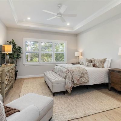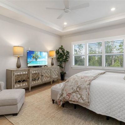 Built-in Features, Ceiling Fan(s), Crown Molding, High Ceilings, In Wall Pest System, Kitchen/Family Room Combo, Open Floorplan, Pest Guard System, Primary Bedroom Main Floor, Solid Surface Counters, Solid Wood Cabinets, Stone Counters, Thermostat, Tray Ceiling(s), Walk-In Closet(s), Window Treatments