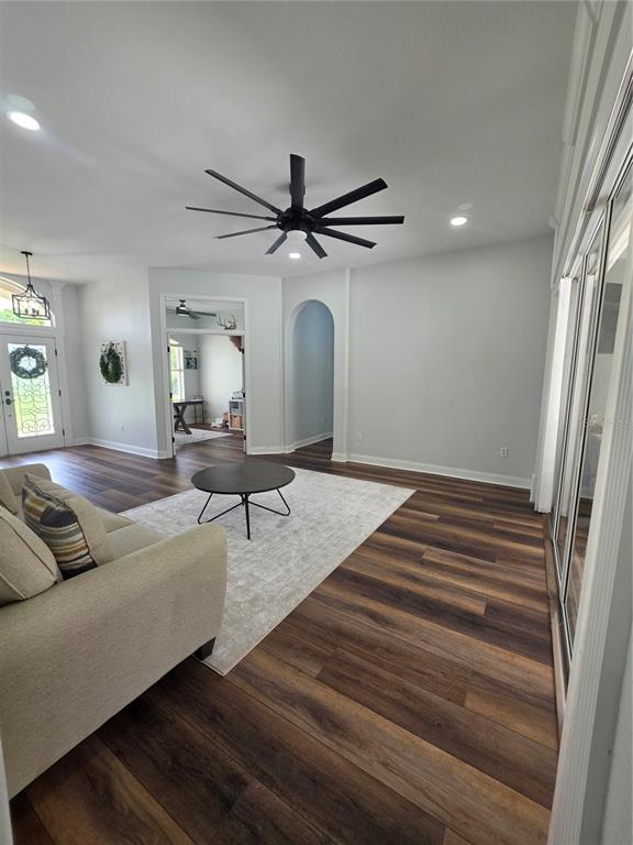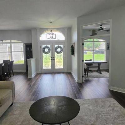 Ceiling Fan(s), Eating Space In Kitchen, High Ceilings, Kitchen/Family Room Combo, Primary Bedroom Main Floor, Solid Surface Counters, Solid Wood Cabinets, Split Bedroom, Stone Counters, Thermostat, Walk-In Closet(s), Window Treatments