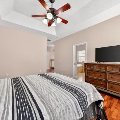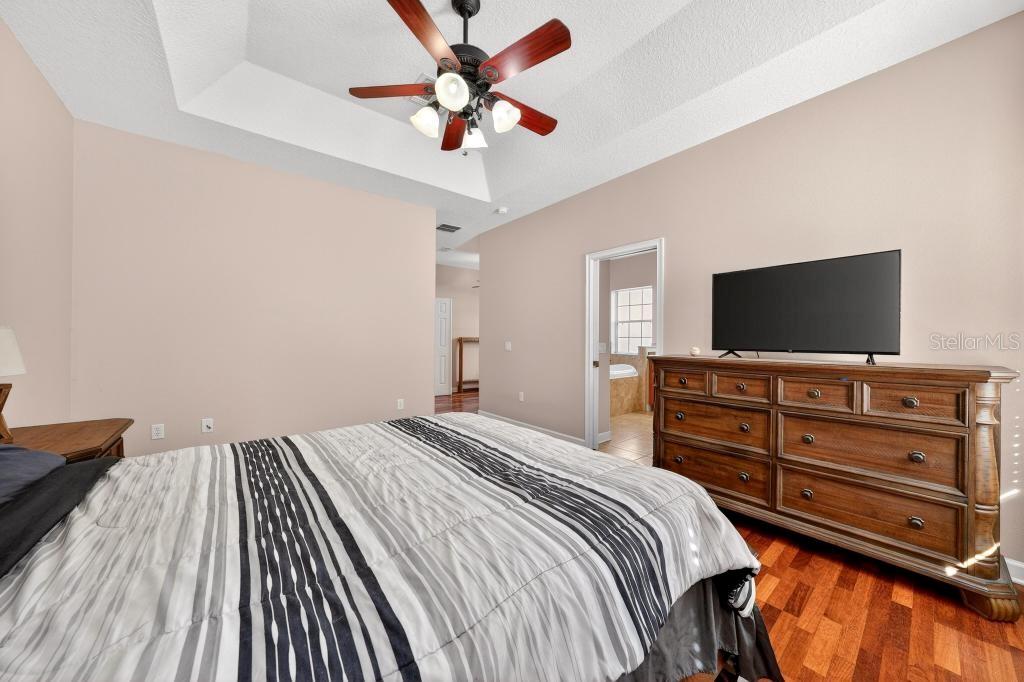 Built-in Features, Ceiling Fan(s), Eating Space In Kitchen, High Ceilings, Primary Bedroom Main Floor, Solid Surface Counters, Solid Wood Cabinets, Thermostat, Tray Ceiling(s)