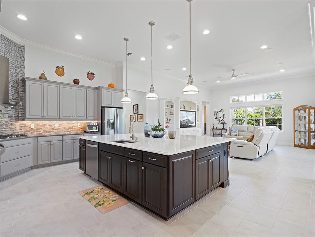 Built-in Features, Ceiling Fan(s), Crown Molding, High Ceilings, Kitchen/Family Room Combo, Open Floorplan, Primary Bedroom Main Floor, Stone Counters, Thermostat, Tray Ceiling(s), Walk-In Closet(s), Window Treatments