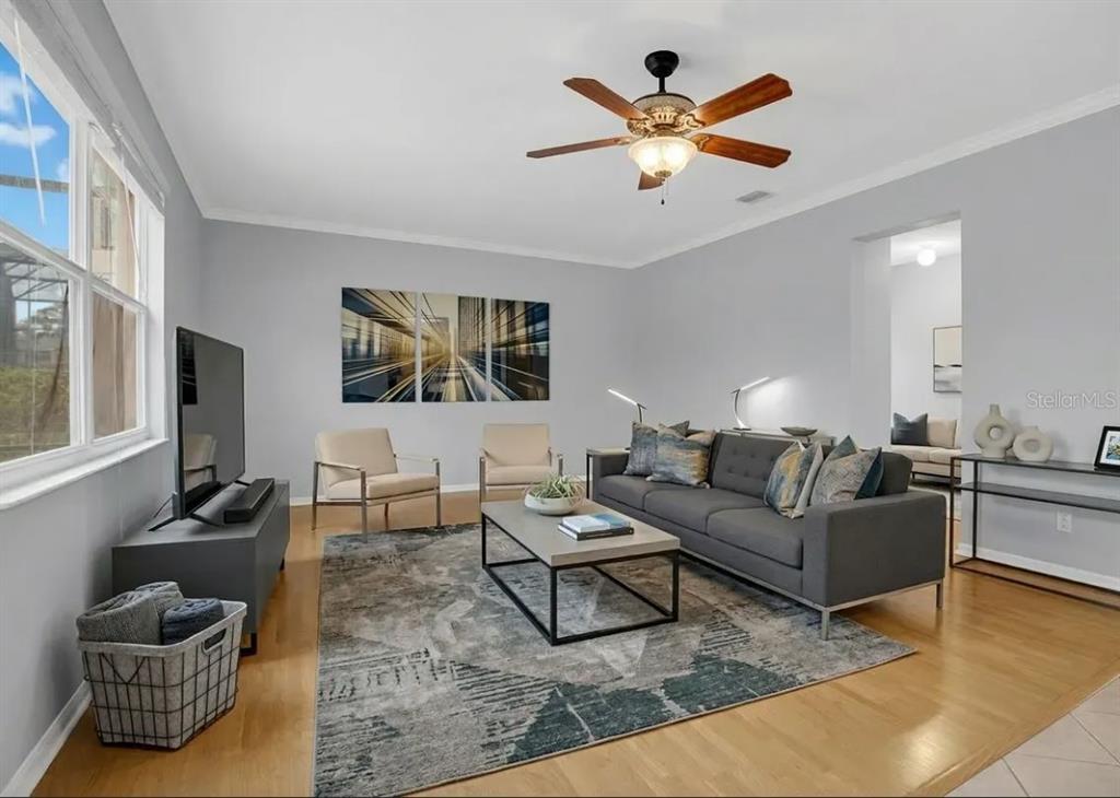 Ceiling Fan(s), Crown Molding, Eating Space In Kitchen, High Ceilings, Kitchen/Family Room Combo, Living Room/Dining Room Combo, PrimaryBedroom Upstairs, Solid Surface Counters, Solid Wood Cabinets, Stone Counters, Walk-In Closet(s)
