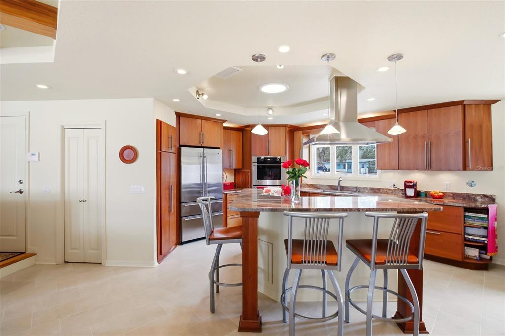 Cathedral Ceiling(s), Ceiling Fan(s), Coffered Ceiling(s), Kitchen/Family Room Combo, Primary Bedroom Main Floor, Skylight(s), Solid Surface Counters, Solid Wood Cabinets, Stone Counters, Thermostat, Walk-In Closet(s), Wet Bar, Window Treatments