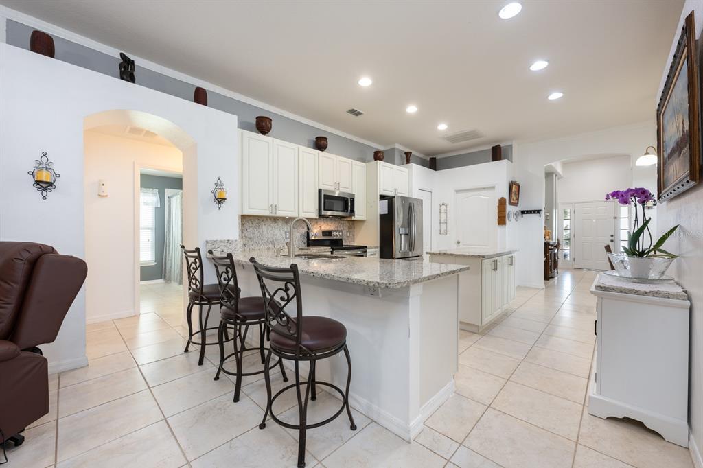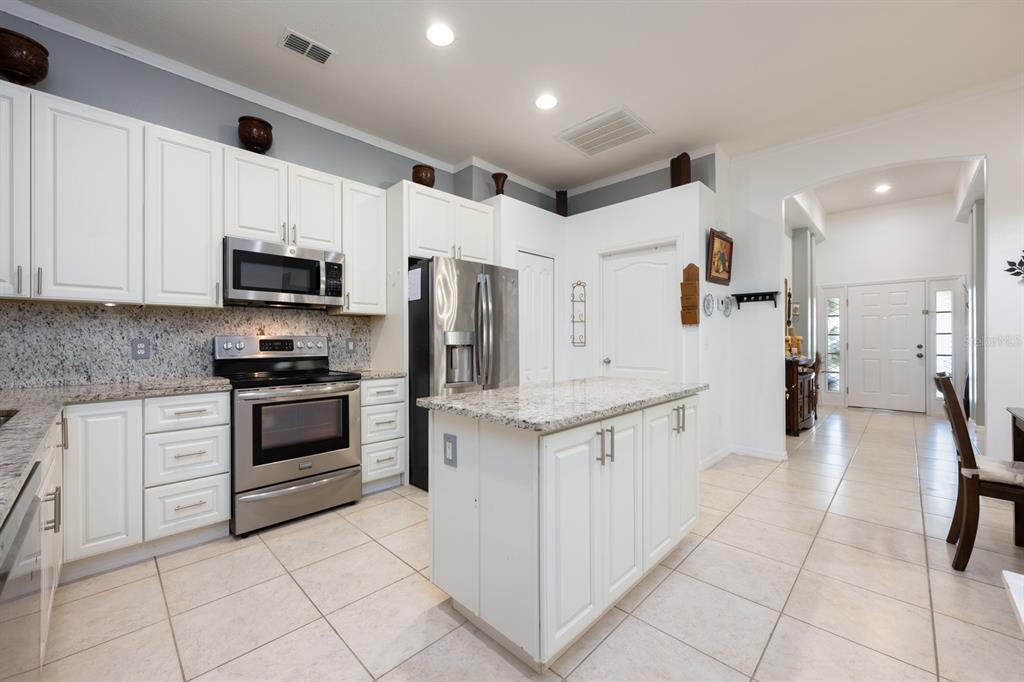 Cathedral Ceiling(s), Crown Molding, Eating Space In Kitchen, High Ceilings, Kitchen/Family Room Combo, Living Room/Dining Room Combo, Open Floorplan, Split Bedroom, Stone Counters, Thermostat, Vaulted Ceiling(s), Walk-In Closet(s), Window Treatments