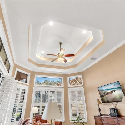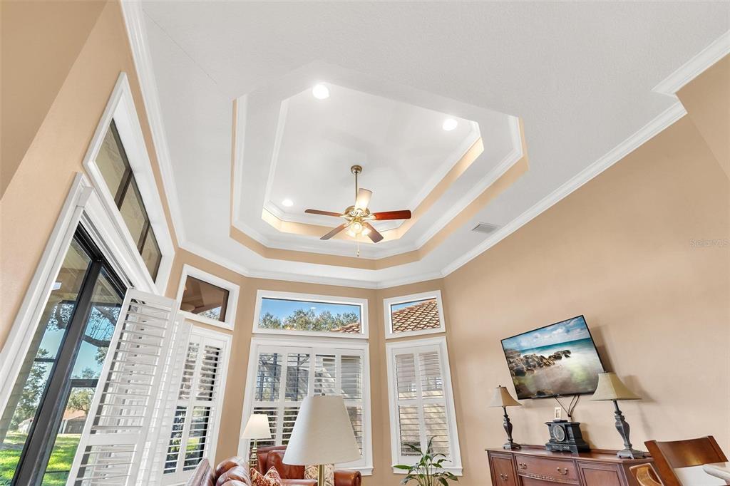 Ceiling Fan(s), Central Vacuum, Coffered Ceiling(s), Crown Molding, High Ceilings, Living Room/Dining Room Combo, Solid Wood Cabinets, Split Bedroom, Tray Ceiling(s), Walk-In Closet(s), Window Treatments